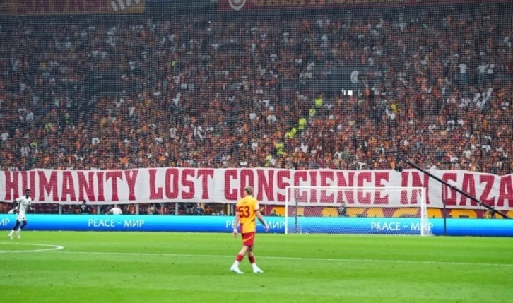 Galatasaray taraftarları, maç öncesi seremonide tribünlere İngilizce "Özgür Filistin" ve "İnsanlık Gazze'de vicdanını kaybetti" yazılı pankartlar açtı.