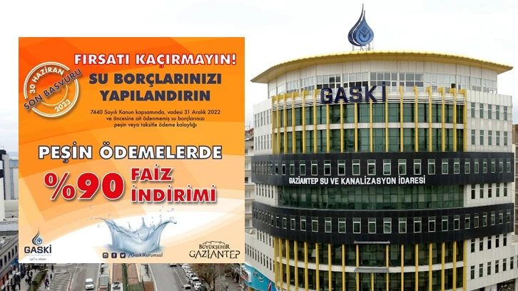 Peşin ödeme yapıldığında 7440 sayılı kanun kapsamında gecikme faizinde yüzde 90 indirim uygulanan su borcu yapılandırma işlemleri için başvurular GASKİ’nin Merkez Hizmet Binası ile Karataş ve diğer ilçelerde bulunan şubelerde yapılacak. Peşin ödeme yapılandırmasının en geç 31 Temmuz 2023 tarihine kadar ödenmesi gerekiyor.
