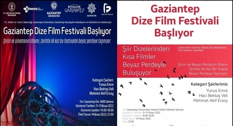 Gaziantep Büyükşehir Belediyesi’ne bağlı Gazikültür A.Ş. tarafından ilhamını Hacı Bektaşi Veli, Yunus Emre ve Mehmet Akif Ersoy’dan alan, ana teması, senaryoları şiirlere bağlı kısa filmlerin gösterime gireceği Gaziantep Dize Film Festivali 11 Nisan’da başlıyor.