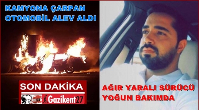 Gaziantep'te, park halindeki kamyona çarpan otomobil alev aldı sürücüsü ağır yaralandı.