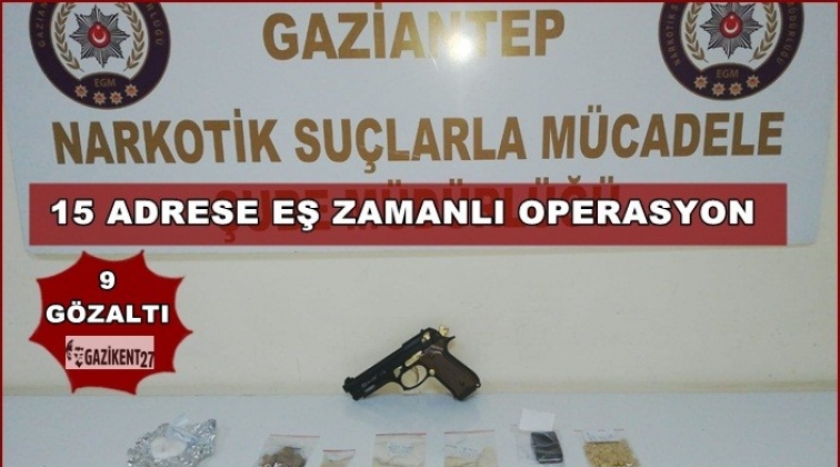 Gaziantep'te 15 adrese eş zamanlı düzenlenen uyuştrucu operasyonlarında 9 kişi gözaltına alındı.