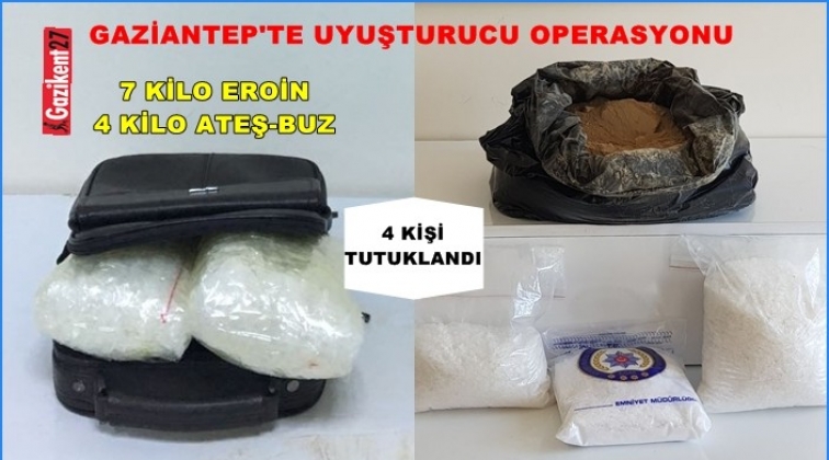 Gaziantep Emniyet Müdürlüğü'nden yapılan açıklamaya göre, uyuşturucu satıcılarının yakalanmalarına yönelik yürütülen operasyonlarda, 7 kilo eroin ile 4 kilo metamfetamin (ateş-buz) uyuşturucu maddesi ele geçirildi. Olayla ilgili yakalanan 4 şüpheli şahıs haklarında yapılan yasal işlemler sonucu tutuklandı.