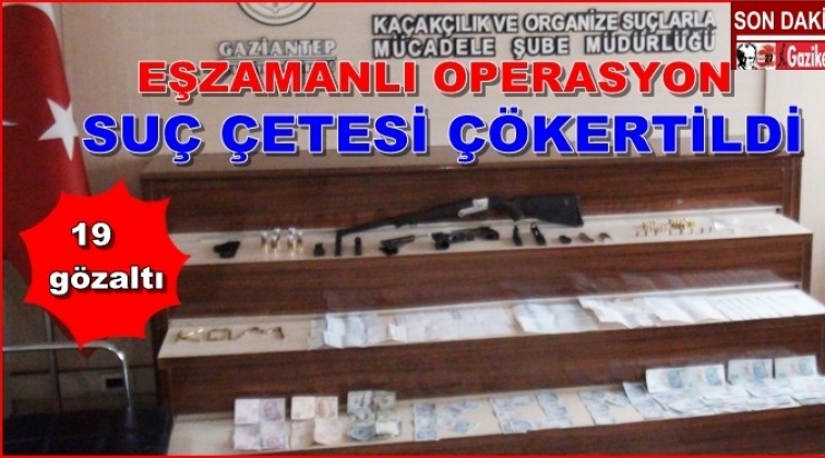 Gaziantep merkezli 4 ilde eş zamanlı düzenlenen operasyonlarda organize suç çetesi çökertildi. Operasyonlarda 19 kişi gözaltına alındı.
