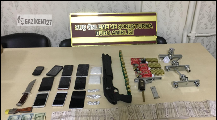 Gaziantep Emniyet Müdürlüğü'nden yapılan açıklamaya göre, Şehitkamil ilçesi Boyno Mahallesi'nde yaşayan S.K isimli şahsın evine yapılan baskın sonucu çok sayıda çalıntı telefon ile kesici ve yaralayıcı suç aleti ele geçirildi. Şahsın evinde yapılan aramalarda 1 adet tabanca, 161 adet dolu fişek, 9 adet çalıntı cep telefonu, 2 adet bıçak, 1 adet av tüfeği, uyuşturucu satışından elde edildiği değerlendirilen bin 320 TL para ile 200 dolar ele geçirildi.