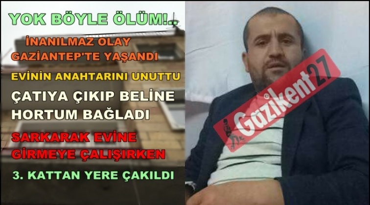 Gaziantep'te anahtarını evde unutan Serdar Çelikay (25), çatıdan evine girmeye çalışırken, beline bağladığı hortumun kopması sonucu üçüncü kattan yere çakılarak hayatını kaybetti.