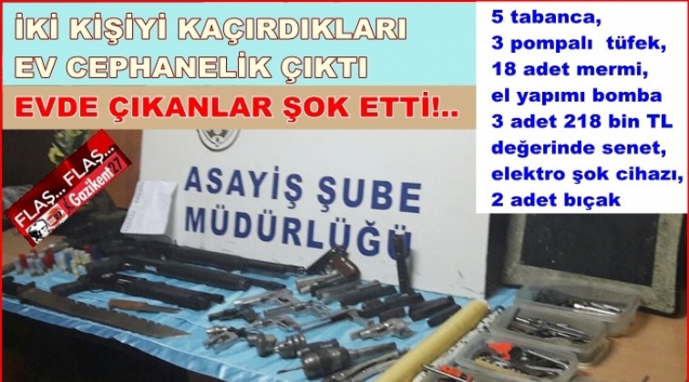 Gaziantep'te kaçırılan iki kişinin bulunduğu evde yapılan aramada, tabanca, pompalı tüfek, el yapımı patlayıcı (EYP), tabanca imalatında kullanılan düzenek, elektro şok cihazı ve 218 bin TL değerinde senet bulundu.