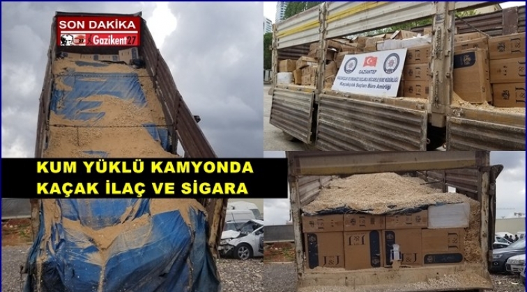 Gaziantep'te kum yüklü kamyona gizlenmiş 82 bin 500 paket gümrük kaçağı sigara ile 29 bin 532 adet gümrük kaçağı tıbbi ilaç ele geçirildi.