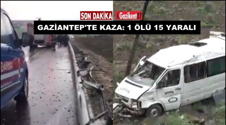 Edinilen bilgiye göre, Gaziantep Kilis karayolunda meydana gelen kazada yolcu taşımacılığı yapan minibüs dolu yağışı nedeniyle kayganlaşan yolda kayarak yoldan çıktı. Bariyerleri parçalayarak boş araziye yuvarlanan minibüste adeta can pazarı yaşandı. Yaşanılan kazada ilk belirlemelere göre minibüste yolcu olarak bulunan 1 kişi hayatını kaybederken, 15 kişi yaralandı.