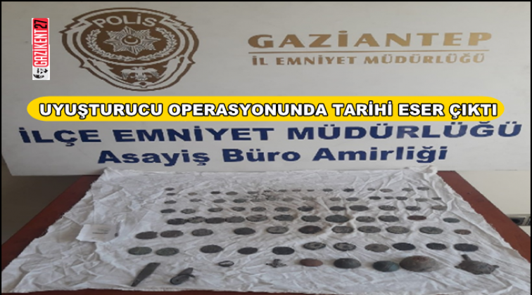 Gaziantep'te polis tarafından düzenlenen uyuşturucu operasyonunda aranan bir evde 86 parça tarihi eser ele geçirilirken, 3 kişi de gözaltına alındı.