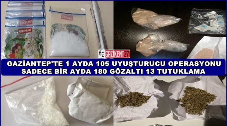 Gaziantep'te polisin bir ayda düzenlediği operasyonlarda 105 uyuşturucu madde olayında 180 kişi gözaltına alındı, bunlardan 13'ü tutuklandı.