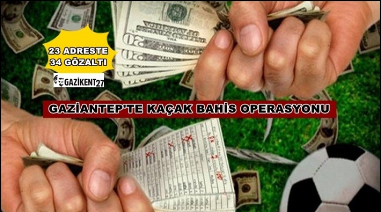 Gaziantep Emniyet Müdürlüğü'nden yapılan açıklamaya göre, Asayiş Şube Müdürlüğü Ahlak Büro Amirliği ekipleri, yasa dışı bahis (kaçak iddia) oynatılan il merkezindeki 23 değişik adrese yapılan eş zamanlı operasyon düzenledi. Yasa dışı bahis oynatan 20 şüpheli şahıs ile yasadışı bahis oynayan 14 şahıs yakalandı. Operasyon yapılan iş yerlerinde yapılan aramalarda ise, yasa dışı bahis oynanmasında ve oynatılmasında kullanılan 5 adet laptop, 30 adet bilgisayar hard diski, 15 adet cep telefonu, 8 adet yazıcı, 51 adet kupon ve 19 bin 417 TL para ele geçirildi. Yakalanan şahıslara 7258 sayılı Kanuna Muhalefetten yasal işlem yapıldı.