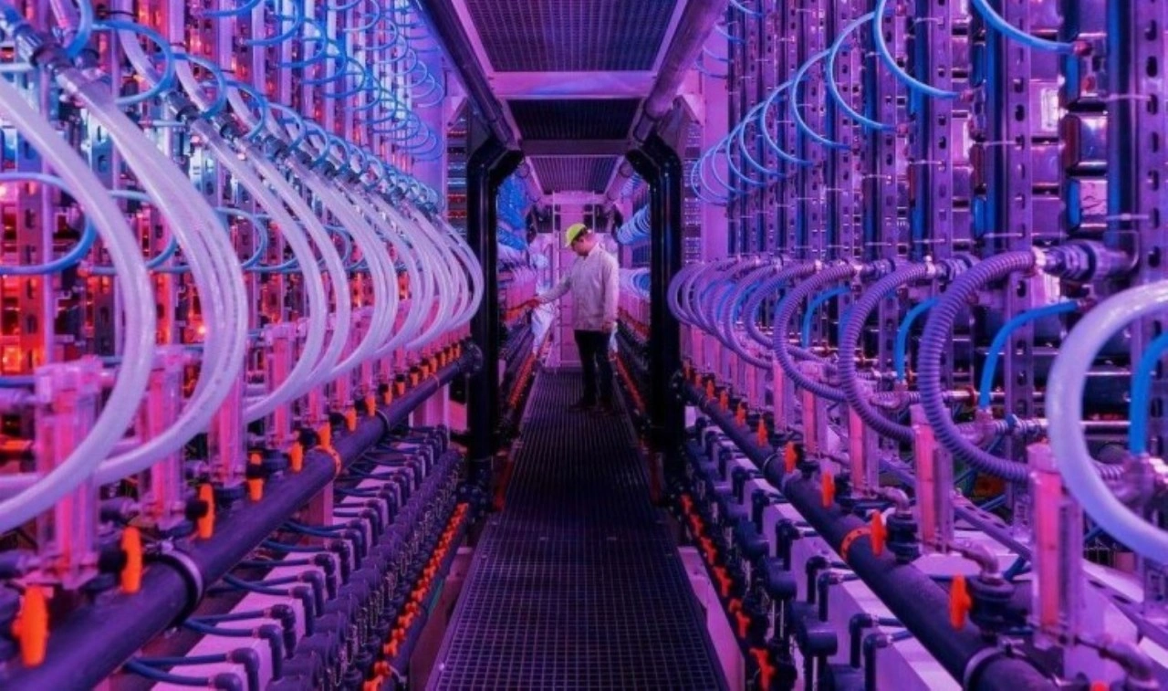 Binlerce ve binlerce küçük mavi ve kırmızı LED ışık, güneş yerine mikroalglerin büyümesine yakıt oluyor.