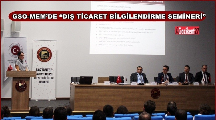 Gaziantep Sanayi Odası Mesleki Eğitim Merkezi'nde (GSO-MEM) Ticaret Bakanlığı uzmanları tarafından verilen seminer kapsamında üyelere, Devlet Destekleri, Dahilde İşleme Rejimi, Pazara Giriş İşlemleri, Ticari Bilgiye Erişim, Malezya ve Hindistan pazarına giriş konularında sunumlar yapıldı.