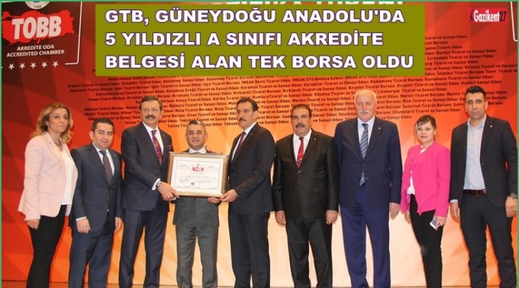 Gaziantep Ticaret Borsası (GTB), Türkiye Odalar ve Borsalar Birliği (TOBB) tarafından düzenlenen 13. Dönem Akreditasyon Sertifika töreninde, Güneydoğu Anadolu Bölgesinde 5 Yıldızlı, A sınıfı Akreditasyon’ sertifikası almaya hak kazanan tek borsa oldu.