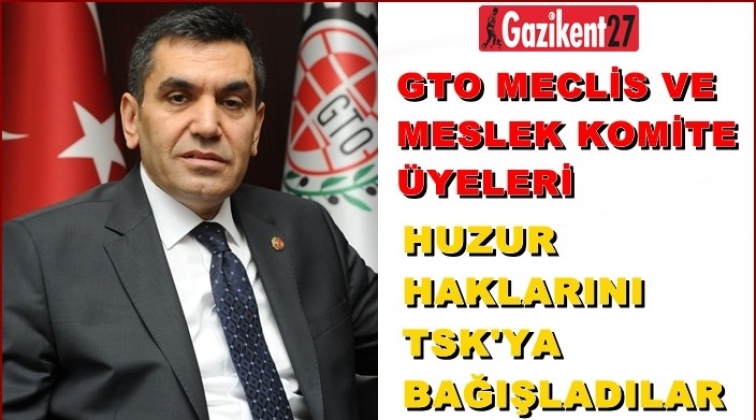 Türk Silahlı Kuvvetlerinin Suriye’nin Afrin şehrinde terör örgütlerine karşı başlattığı “Zeytin Dalı” hareketi devam ederken, Gaziantep Ticaret Odası (GTO) Meclis ve Meslek Komite üyeleri de örnek bir davranışa imza atarak huzur haklarını Türk Silahlı Kuvvetleri Dayanışma Vakfı’na bağışladı.