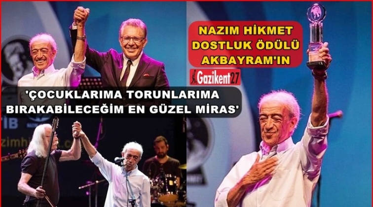 Türk müziğinin efsane sesi Gaziantepli Edip Akbayram'a, ‘Nâzım Hikmet Dostluk Ödülü' Moskova’da düzenlenen ‘Nazım Hikmet’i Anma Törenleri'nde verildi. Akbayram, “Çok büyük bir onur benim için. Torunlarıma bırakacağım güzel bir miras” dedi.