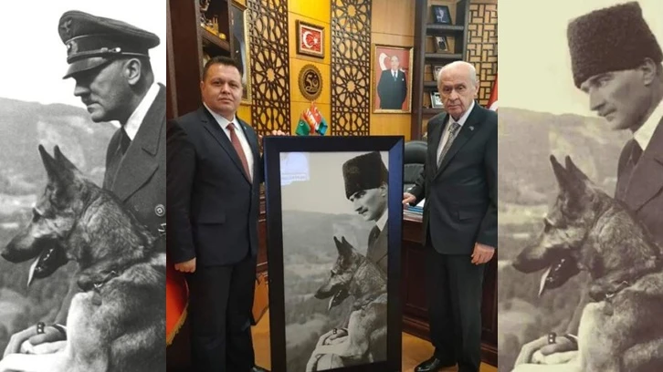 MHP Manisa İl Başkanı olan Cüneyt Tosuner, Hitler'in "Atatürk montajlı" fotoğrafını çerçeveleterek MHP Genel Başkanı Devlet Bahçeli'ye hediye etti.