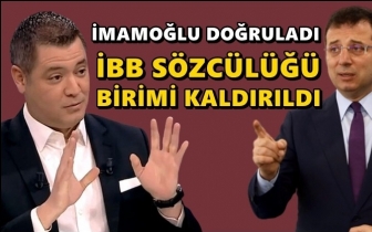 İMAMOĞLU DOĞRULADIİstanbul Büyükşehir Belediye Başkanı Ekrem İmamoğlu, TELE 1’e yaptığı açıklamada İBB Sözcülük Birimi’nin kaldırıldığını doğrulayıp Murat Ongun’un başka bir göreve başlayacağını söyledi.