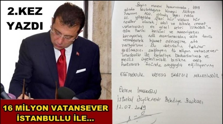 İmamoğlu, toplu fotoğraf çekiminin ardından Anıtkabir özel defterini imzaladı. İmamoğlu, deftere yazdığı, ”Türkiye Cumhuriye’nin kurucusu Mustafa Kemal Atatürk. Bugün manevi huzurunuzda, 1919 yılında başlattığınız Kuvay-i Milliye ruhunun 100. yılında aynı ruhla, 21. yüzyılda, fikri hür vicdanı hür nesiller olarak; akıl ve bilimle cennet vatanımızın en güzel şehri İstanbul’a, tüm tarihi birkimi ve maneviyatını koruyarak, milli unsurlarımızdan asla taviz vermeyerek hizmet edeceğime söz veriyorum. Bu satırların tekrar yazılmasını sağlayan 16 milyon vatansever İstanbullu ile belediye başkanlarımız ve meclis üyelerimizle birlikte aziz hatıranız önünde saygıyla eğiliyorum. Egemenlik kayıtsız şartsız milletindir. Ekrem İmamoğlu. İstanbul Büyükşehir Belediye Başkanı” cümlelerini kameralar karşısında yüksek sesle okudu.
