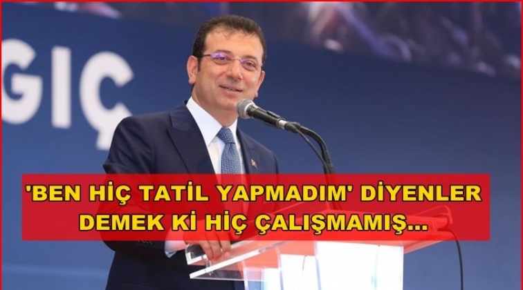 İmamoğlu, kendisini "tatil" üzerinden eleştiren çevrelere, "Tatil çok konuşuluyor bu aralar biliyorsunuz. Birincisi, birisi demiş ki, 'Ben, hayatımda hiç tatile çıkmadım.' Şu olduğunda da çıkmadım, bu olduğunda da çıkmadım! Profesyonel hayatta böyle birine şöyle bir söz söylenir; 'Demek ki hiç çalışmamışsın!' Sonuçta her insanın makul ve mantıklı tatile ihtiyacı vardır" yanıtını verdi.