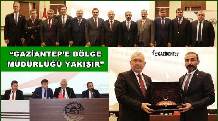 İş dünyası ve ihracatçıların yoğun ilgi gösterdiği toplantıda; GTO Yönetim Kurulu Başkanı Tuncay Yıldırım’ın Gaziantep’e Eximbank Bölge Müdürlüğü kurulması çağrısına Türk Eximbank Genel Müdürü Adnan Yıldırım olumlu yanıt vererek Ankara ve İzmir’den sonra üçüncü Bölge Müdürlüğü’nün Gaziantep’te kurulacağı müjdesini verdi.