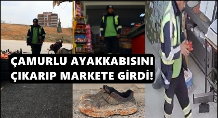 Gaziantep'te belediye işçisi Ahmet Ataş, ağaçlandırma çalışmasına ara vererek gittiği markete girmeden önce çamurlu ayakkabılarını çıkarıp, alışveriş yaptı.