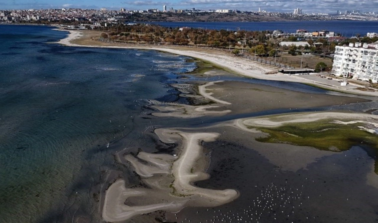 İstanbul Küçükçekmece’deki Menekşe Sahili’nde deniz suyu çekilerek, sahil boyunca küçük adacıklar oluştu.