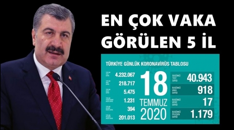 Sağlık Bakanı Fahrettin Koca, güncel corona virüsü verilerini açıkladı. Verilere göre, bugün 17 kişi hayatını kaybederken, 918 yeni vaka tespit edildi. Bakan Koca, "Son 3 günde en çok vaka görülen beş ilimiz: İstanbul, Ankara, Gaziantep, Konya, Diyarbakır" bilgilerini paylaştı.