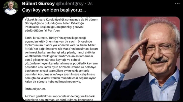 İYİ Parti Genel İdare Kurulu Üyesi Bülent Gürsoy, İYİ Parti Genel Başkanı Meral Akşener'in CHP Genel Başkanı Kemal Kılıçdaroğlu'nun cumhurbaşkanı adaylığını desteklemeyeceğini açıklamasının ardından partideki görevinden istifa etti. Kılıçdaroğlu'nun adaylığını destekleyeceğini açıklayan Gürsoy, "Çayı koy yeniden başlıyoruz.." dedi.