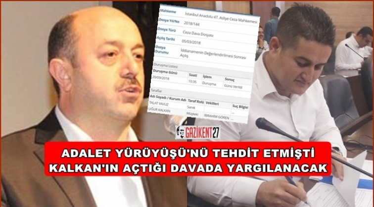 CHP Şahinbey Belediye Meclis Üyesi Uğur Kalkan, adalet yürüyüşünü tehdit eden Eğitim Bir Sen’in İstanbul 4 No’lu Şube Başkanı Talat Yavuz hakkında şikayetçi olmuştu. Yavuz, sanık olarak hakim karşısına çıkacak.