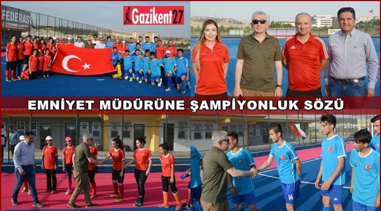 Katılacakları açık alan Avrupa Şampiyon Kulüpler Şampiyonası önce son antrenmanlarını yapan Gaziantep Polisgücü kadın ve erkek hokey takımlarını antrenmanda ziyaret eden Gaziantep Emniyet Müdürü Faruk Karaduman Kulüp Başkanı Mehmet Kaplan ve teknik heyetten bilgiler aldı. Şampiyona öncesi yoğun bir kamp dönemi yaşadıklarını ifade eden Başkan Kaplan Emniyet Müdürü Karaduman’a ziyaretlerinin kendileri için önemli bir moral kaynağı olduğunu ifade ederek teşekkür etti. Sporcularla da sohbet eden Emniyet Müdürü Faruk Karaduman “Sizlere inanıyoruz ve güveniyoruz. Yıllardır Avrupa’da ülkemizi başarıyla temsil ediyorsunuz. Şanlı bayrağımızı Avrupa’nın çeşitli ülkelerinde gururla dalgalandırıyor ve Avrupa Şampiyonluk kupalarını ülkemize getiriyorsunuz. Biz sizlerin şampiyon olmasına alıştık. Bu kez de inanıyoruz ki yeniden şampiyon olacak ve bir üst lige yükseleceksiniz. Güle güle gidin. Yüreklerimiz sizinle. Başarılar diliyorum her iki takımıza” dedi. Sporcularla toplu fotoğraf çektiren Gaziantep Emniyet Müdürü Faruk Karaduman sporculardan şampiyonluk kupası için söz aldı. Sporcular da bir kez daha Avrupa Şampiyonluk kupasını Türkiye’ye getireceklerine dair söz verdi.