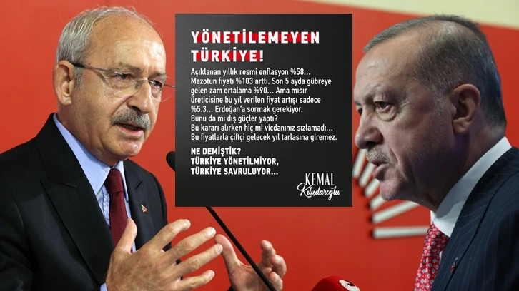 Kılıçdaroğlu, "Açıklanan yıllık resmi enflasyon %58… Mazotun fiyatı %103 arttı. Son 5 ayda gübreye gelen zam ortalama %90… Ama mısır üreticisine bu yıl verilen fiyat artışı sadece %5.3… Erdoğan’a sormak gerekiyor. Bunu da mı dış güçler yaptı? Bu kararı alırken hiç mi vicdanınız sızlamadı…" ifadelerini kullandı.
