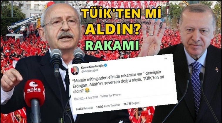 Twitter hesabından açıklama yapan Kemal Kılıçdaroğlu, “Mersin mitinginden elimde rakamlar var demişsin Erdoğan. Allah’ını seversen doğru söyle, TÜİK’ten mi aldın?” ifadelerini kullandı.