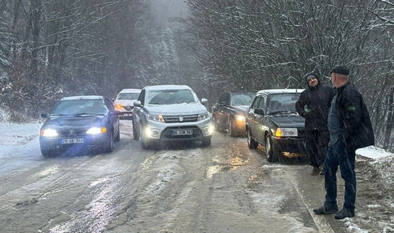 Kış lastiği takmayan araçlar karla kaplanan yollarda mahsur kaldı.