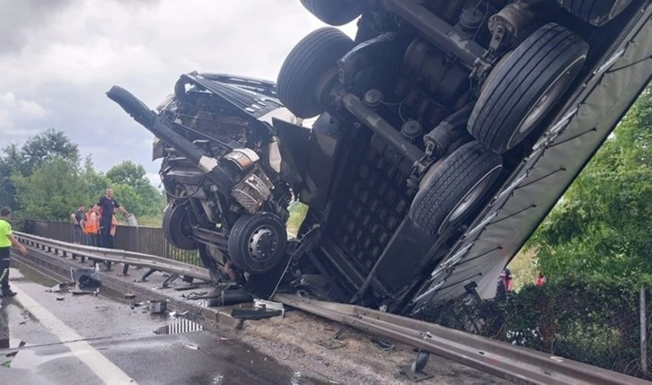 Feci kaza, öğle saatlerinde TEM Otoyolu'nun Akyazı geçişinde meydana geldi. İstanbul istikametine giden Umut Oğurlu yönetimindeki 21 AFA 919 plakalı canlı büyükbaş yüklü TIR, sürücüsünün kontrolünden çıktı.