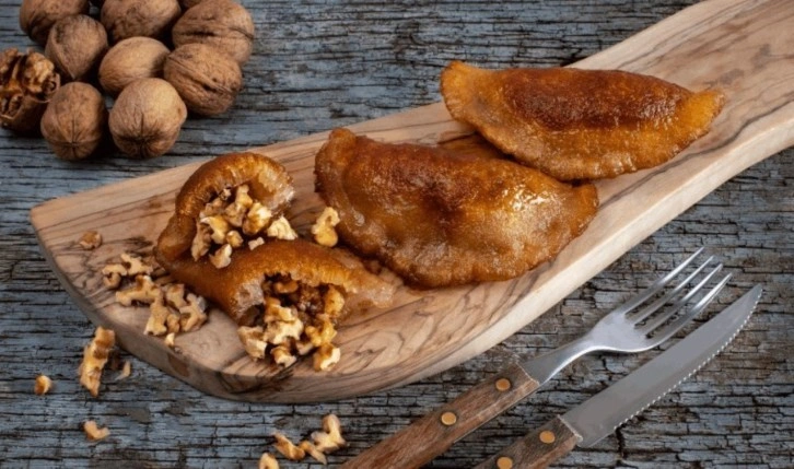 Pişen kadayıfların içine cevizli harçtan bir miktar koyun ve yarım ay şeklinde kapatın.