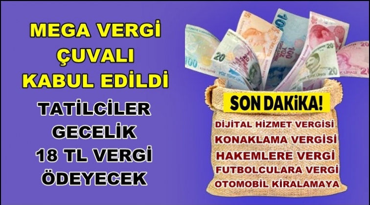 Zenginden daha fazla vergi alınmasını öngören tasarı Plan ve Bütçe Komisyonu'nda kabul edildi. Buna göre yıllık geliri 500 bin TL'den fazla olanlar artık daha fazla vergi ödeyecek. Tatile çıkan vatandaş 5 yıldızlı otelde kaldığı her gece için kişi başına ekstra 18 TL vermek zorunda kalacak. Dijital Hizmet Vergisi ile Türkiye'de iş yapan dev şirketler yüzde 7.5 vergi ödeyecek. Zamanında ödenmediği için getirilen vergi cezalarında yüzde 50'ye kadar indirim yapılabilecek. Futbolculara ve hakemler artık vergi ödeyecek. Yeni vergilerden Hazine'ye yılda 6 milyar TL girmesi öngörülüyor.
