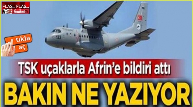 TSK'nın resmi Twitter hesabından paylaşılan bildiride, "Türk Silahlı Kuvvetleri tarafından, dost ve kardeş Afrin halkına yönelik aşağıdaki bildiri Arapça ve Kürtçe olarak havadan atılmıştır." denildi.