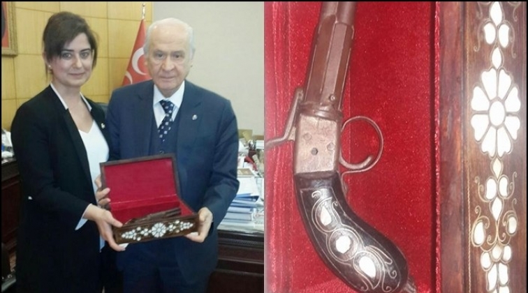 Milliyetçi Hareket Partisi Gaziantep Kadın Kolları Başkanı Özlem Canpolat, MHP Genel Başkanı Devlet Bahçeli’ye Gaziantep Savunması'nda kullanılmış bir tabanca hediye etti.