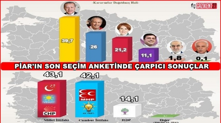 Piar Araştırma şirketi 24 Haziran erken seçimi için son anket sonuçlarını yayınladı. Araştırmada en dikkat çekici sonucu Millet İttifakı'nın oy oranlarının Cumhur İttifakı'ndan fazla olması oldu.