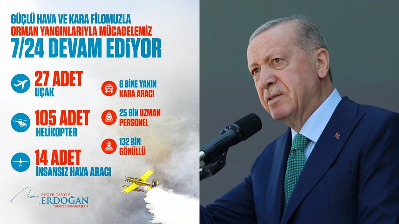 Erdoğan, sosyal medya hesabından yaptığı paylaşımda, Türkiye'nin orman yangınlarına karşı havadan ve karadan büyük bir mücadele yürüttüğünü belirtti.