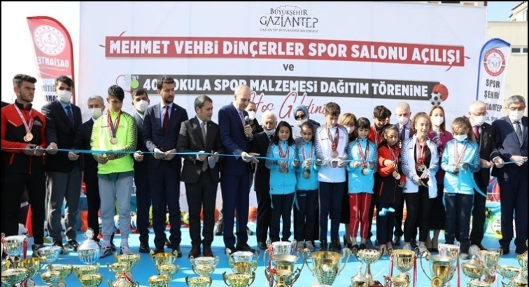 Kurtulmuş, şehrin dört bir yanını spor salonları ve yüzme havuzlarıyla donatan Büyükşehir Belediyesi’nin Spor Toto ile ortaklaşa hareket ederek hizmete açtığı Mehmet Vehbi Dinçerler Spor Salonu için düzenlenen resmi açılış törenine katıldı. Törende Kurtulmuş, Gaziantep genelinde bulunan 400 okula dağıtılacak spor malzemeleri için 2,5 milyonluk temsili çeki GBB Başkanı Fatma Şahin, Gaziantep Valisi Davut Gül ve İl Milli Eğitim Müdürü Yasin Tepe’ye takdim etti. Açılış konuşmalarının ardından protokol, tesisi gezdi.