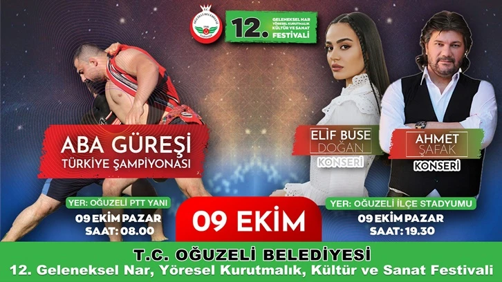 08 Ekim Cumartesi günü ‘Nar Hasadı’ ile başlayacak olan 12. Geleneksel Nar, Yöresel Kurutmalık, Kültür ve Sanat Festivali 09 Pazar günü sabah 08.00- 15.30 saatleri arasında gerçekleştirilecek Aba Güreşleri Türkiye Şampiyonası ile devam ederek, akşam 19.30’da ise son günlerin popüler sanatçıları Elif Buse Doğan ve Ahmet Şafak konseri ile son bulacak.