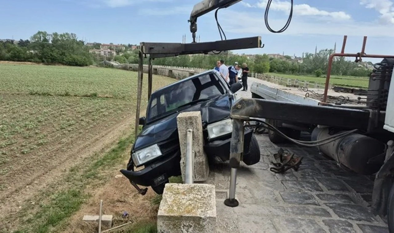 Edirne’nin Saraçhane Köprüsü’nde seyreden Tugay Kısaç’ın kullandığı 22 AAP 021 plakalı otomobil köprünün bariyerlerine çarptı. Otomobilin tarlaya uçmasına ramak kala, bariyer korkulukları aracı tuttu.