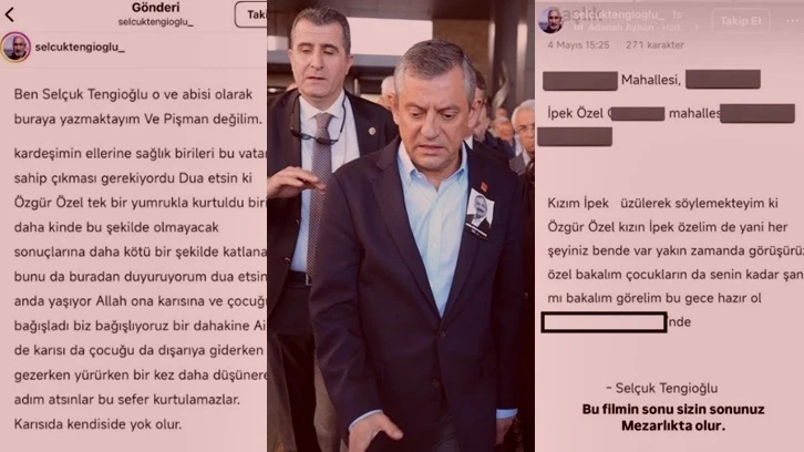Bir diğer paylaşımda ise bir kişi kendisini 'Selçuk Tengioğlu' olarak tanıttı ve “kardeşimin ellerine sağlık”, “bu sefer kurtulamazlar”, “karısı da kendisi de yok olur” gibi ifadelerle ölüm tehdidinde bulundu. “Ayağını denk alacaksın @eczozgurozel bir dahakine sen değil ailen” ifadeleriyle Özgür Özel’in eşi ve çocuğu da ölümle tehdit edildi.