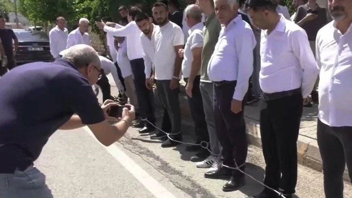 Yola dizilen Adıyamanlı vatandaşlar, Belediye Başkanı Tutdere'nin ayağına takılan kelepçeye tepki olarak ayaklarına zincir bağladı.
