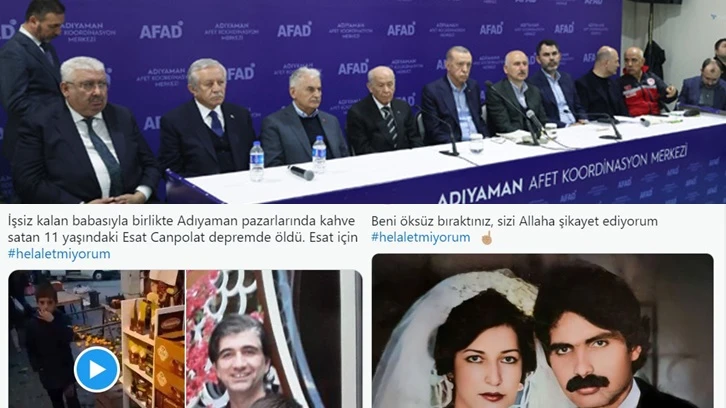 Cumhurbaşkanı Tayyip Erdoğan bugün MHP Genel Başkanı Devlet Bahçeli ile Adıyaman'ı ziyaret etti. Erdoğan burada yaptığı açıklamada Adıyamanlılardan 'Helallik' istedi. “Sarsıntıların yıkıcı etkisi, olumsuz hava nedeniyle ilk birkaç gün Adıyaman'da arzu ettiğimiz etkinlikte çalışma yürütemedik. Bunun için sizden helallik istiyorum" diyen Erdoğan'a siyasi partilerden ve sosyal medya kullanıcılarından tepki geldi. Twitter'da #helaletmiyorum başlığı Trend Topic (TT) oldu.