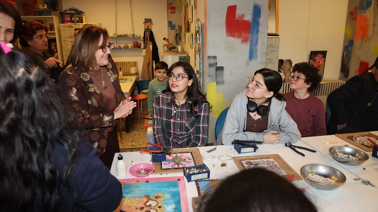 Atölyelerin devam ettiği Kahraman Emmioğlu Kültür ve Sanat Merkezi’nde kursiyerlerle bir araya gelen Başkan Fatma Şahin, piyano, keman ve resim eğitimi alan çocukların çalışmalarını yakından inceleyerek performanslarını izledi.