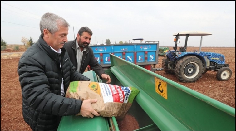 Şahinbey Belediye Başkanı Mehmet Tahmazoğlu, çiftçilerin desteklenmesi için dağıttığı buğday tohumunu ve gübreyi çiftçilerle birlikte toprakla buluşturdu.