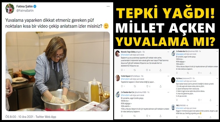 AKP'li Gaziantep Büyükşehir Belediye Başkanı Fatma Şahin'in sosyal medya hesabından yaptığı 'Yuvalama yapma tarifi' paylaşımına tepki yağdı.